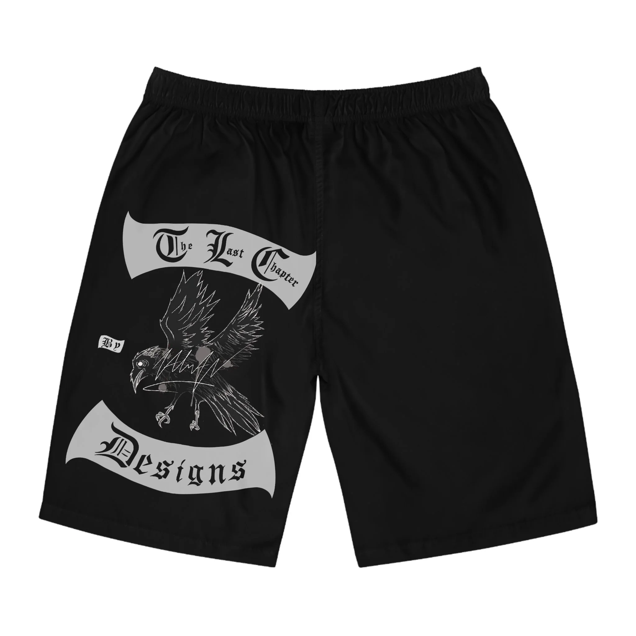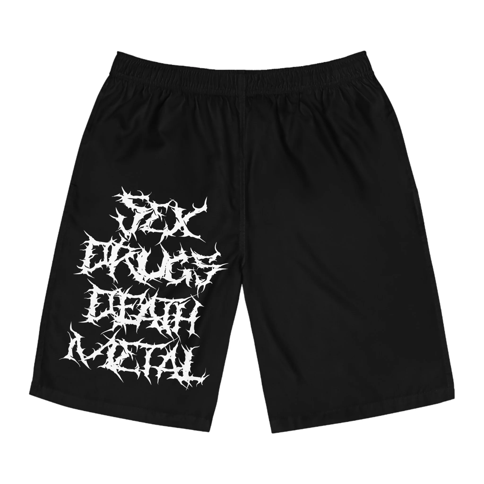 These board shorts bring dark, underground energy to the beach or the backyard. Lightweight 100% polyester keeps movement effortless and dries fast after a dip. The elastic waistband and drawstring sit comfortably whether you’re surfing dawn swell or lounging by a bonfire. Stark black fabric with bold, jagged white lettering and a brooding raven motif gives the shorts a raw, metal-inspired edge—wear them when you want your look to read loud and clear. Pairs easily with a worn band tee, skate shoes, or barefoot sand; they feel like the kind of piece that follows you from summer mosh to late-night shore walks.