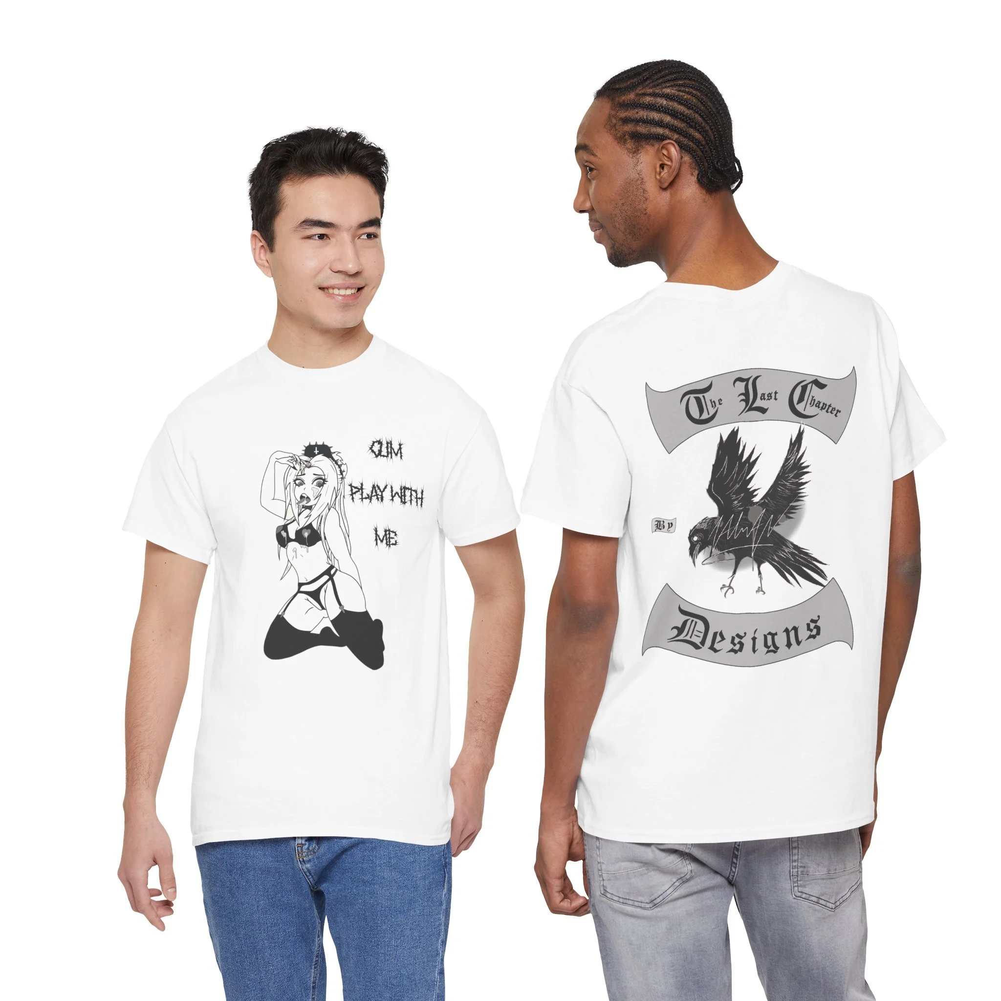 This cotton tee carries a raw, underground edge — a soft white canvas printed with bold grayscale art that leans punk and streetwear. The front shows a defiant, sketch-like figure seated low, while the back features a snarling raven framed by gothic banners reading a maker’s name. It feels lived-in and expressive: the kind of shirt you reach for when you want your outfit to speak without shouting. Lightweight but sturdy, it layers easily under a denim jacket or wears alone with ripped jeans. Wear it to shows, late-night hangs, or when you want to bring a bit of gritty attitude to a quiet day.