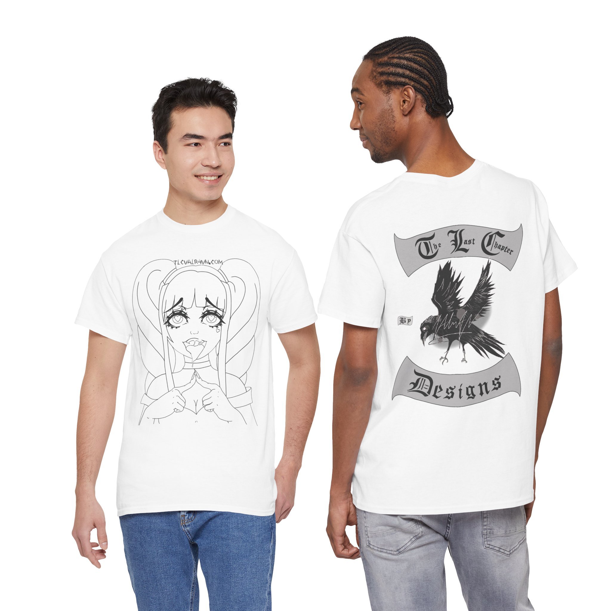 This cotton tee carries a raw, underground edge — a soft white canvas printed with bold grayscale art that leans punk and streetwear. The front shows a defiant, sketch-like figure seated low, while the back features a snarling raven framed by gothic banners reading a maker’s name. It feels lived-in and expressive: the kind of shirt you reach for when you want your outfit to speak without shouting. Lightweight but sturdy, it layers easily under a denim jacket or wears alone with ripped jeans. Wear it to shows, late-night hangs, or when you want to bring a bit of gritty attitude to a quiet day.