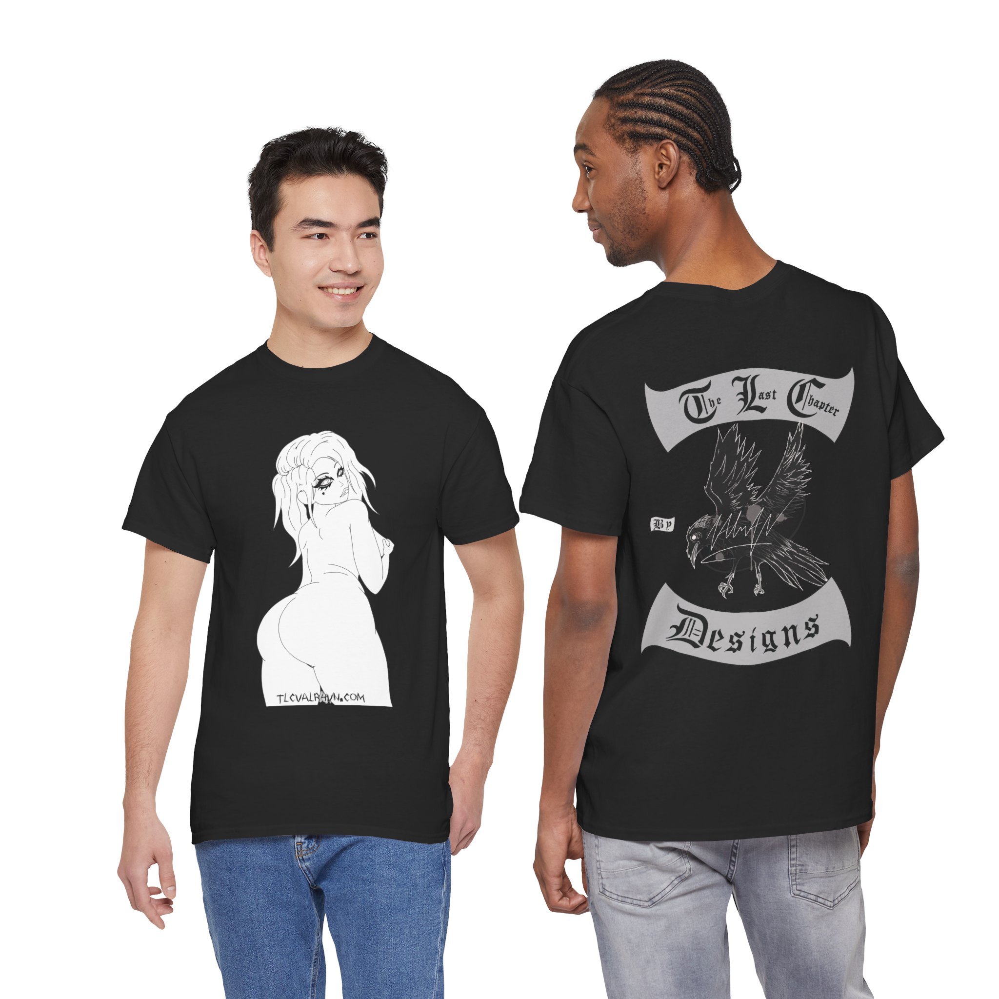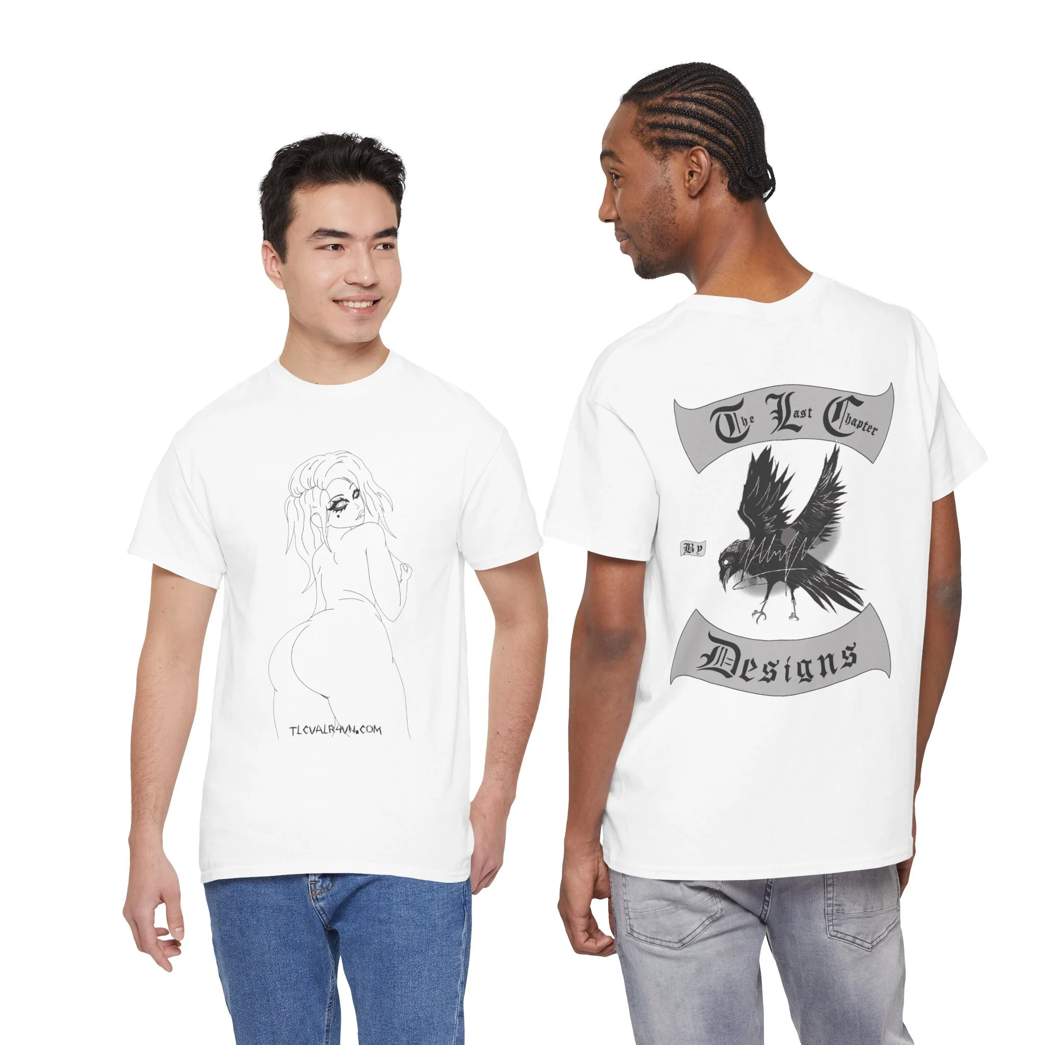 This cotton tee carries a raw, underground edge — a soft white canvas printed with bold grayscale art that leans punk and streetwear. The front shows a defiant, sketch-like figure seated low, while the back features a snarling raven framed by gothic banners reading a maker’s name. It feels lived-in and expressive: the kind of shirt you reach for when you want your outfit to speak without shouting. Lightweight but sturdy, it layers easily under a denim jacket or wears alone with ripped jeans. Wear it to shows, late-night hangs, or when you want to bring a bit of gritty attitude to a quiet day.