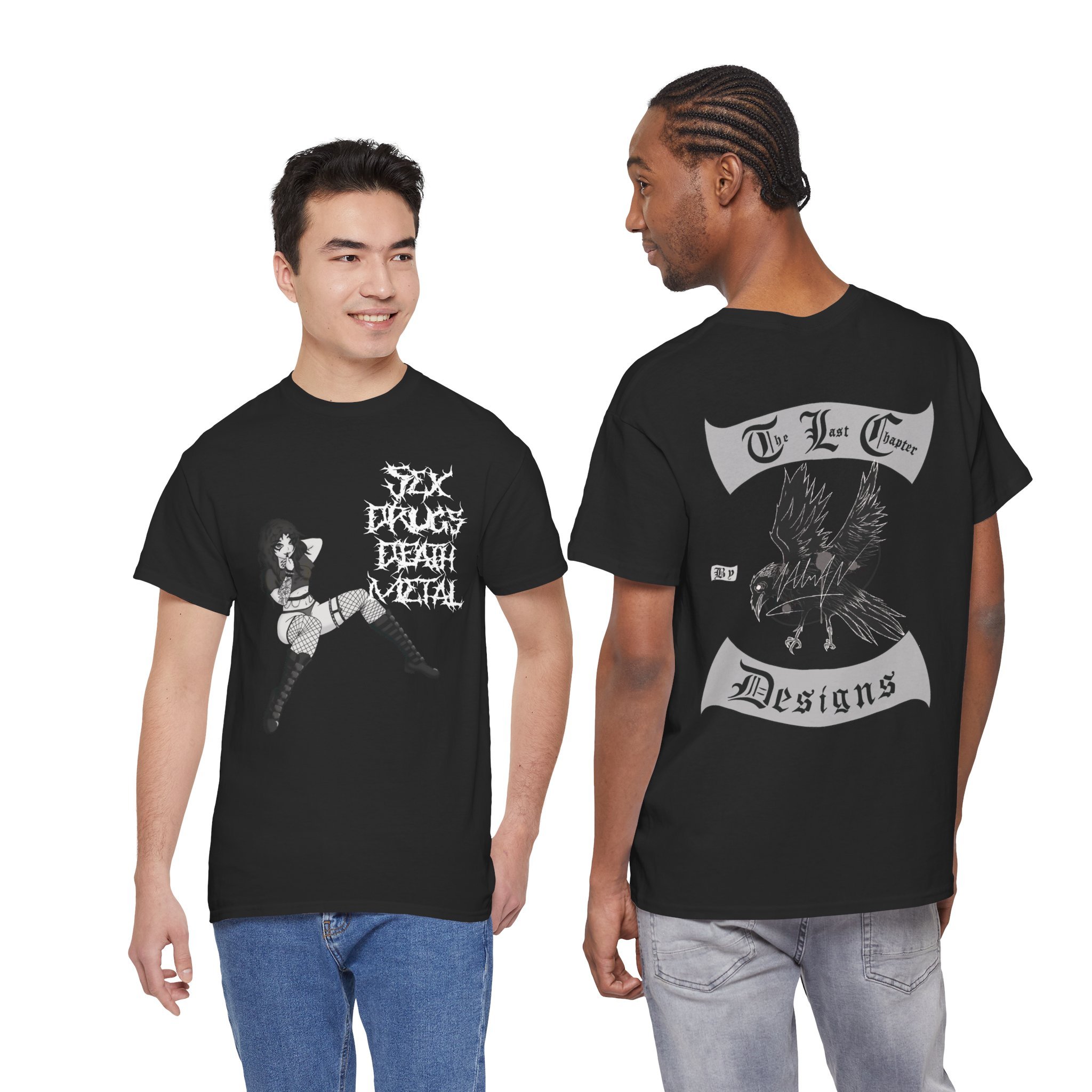 This cotton tee carries a raw, underground edge — a soft white canvas printed with bold grayscale art that leans punk and streetwear. The front shows a defiant, sketch-like figure seated low, while the back features a snarling raven framed by gothic banners reading a maker’s name. It feels lived-in and expressive: the kind of shirt you reach for when you want your outfit to speak without shouting. Lightweight but sturdy, it layers easily under a denim jacket or wears alone with ripped jeans. Wear it to shows, late-night hangs, or when you want to bring a bit of gritty attitude to a quiet day.