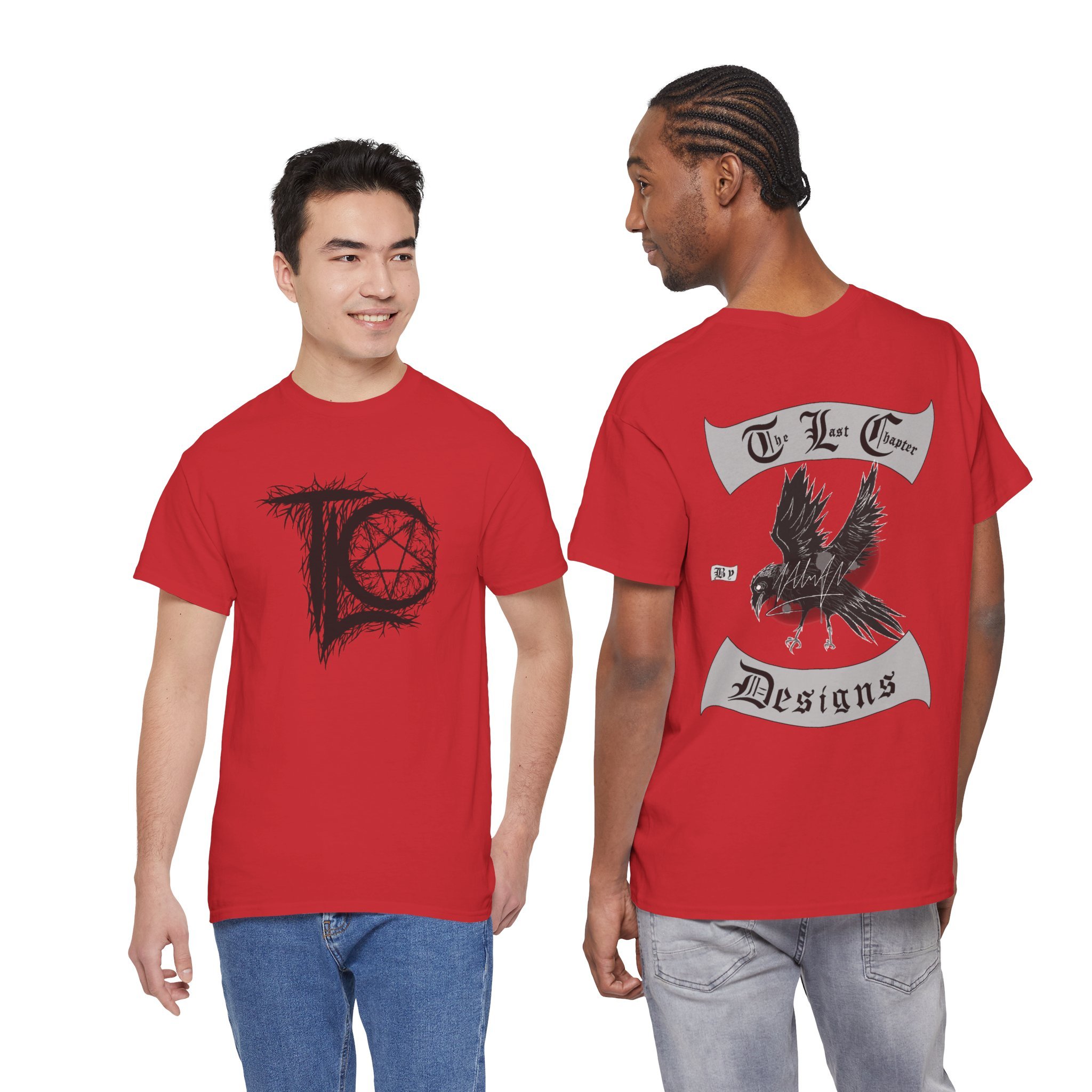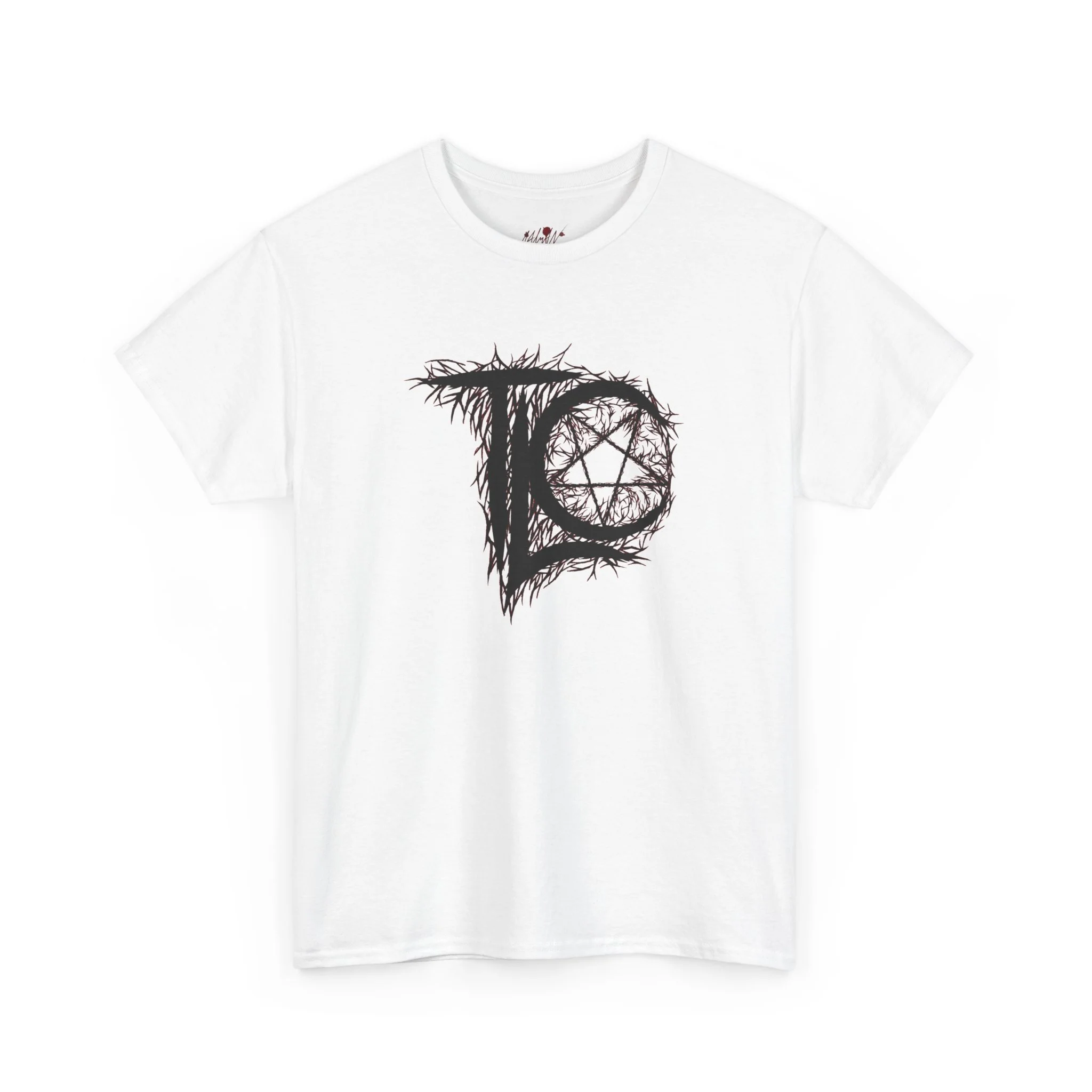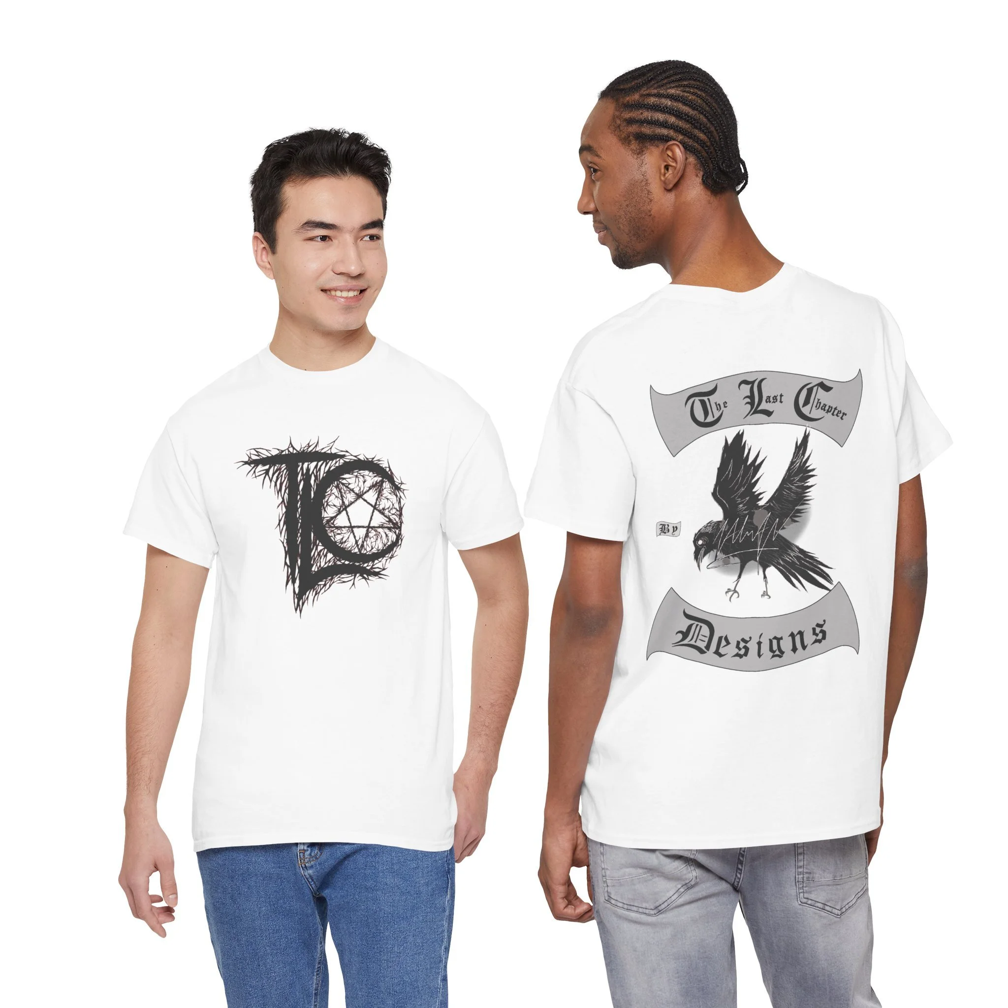 This cotton tee carries a raw, underground edge — a soft white canvas printed with bold grayscale art that leans punk and streetwear. The front shows a defiant, sketch-like figure seated low, while the back features a snarling raven framed by gothic banners reading a maker’s name. It feels lived-in and expressive: the kind of shirt you reach for when you want your outfit to speak without shouting. Lightweight but sturdy, it layers easily under a denim jacket or wears alone with ripped jeans. Wear it to shows, late-night hangs, or when you want to bring a bit of gritty attitude to a quiet day.