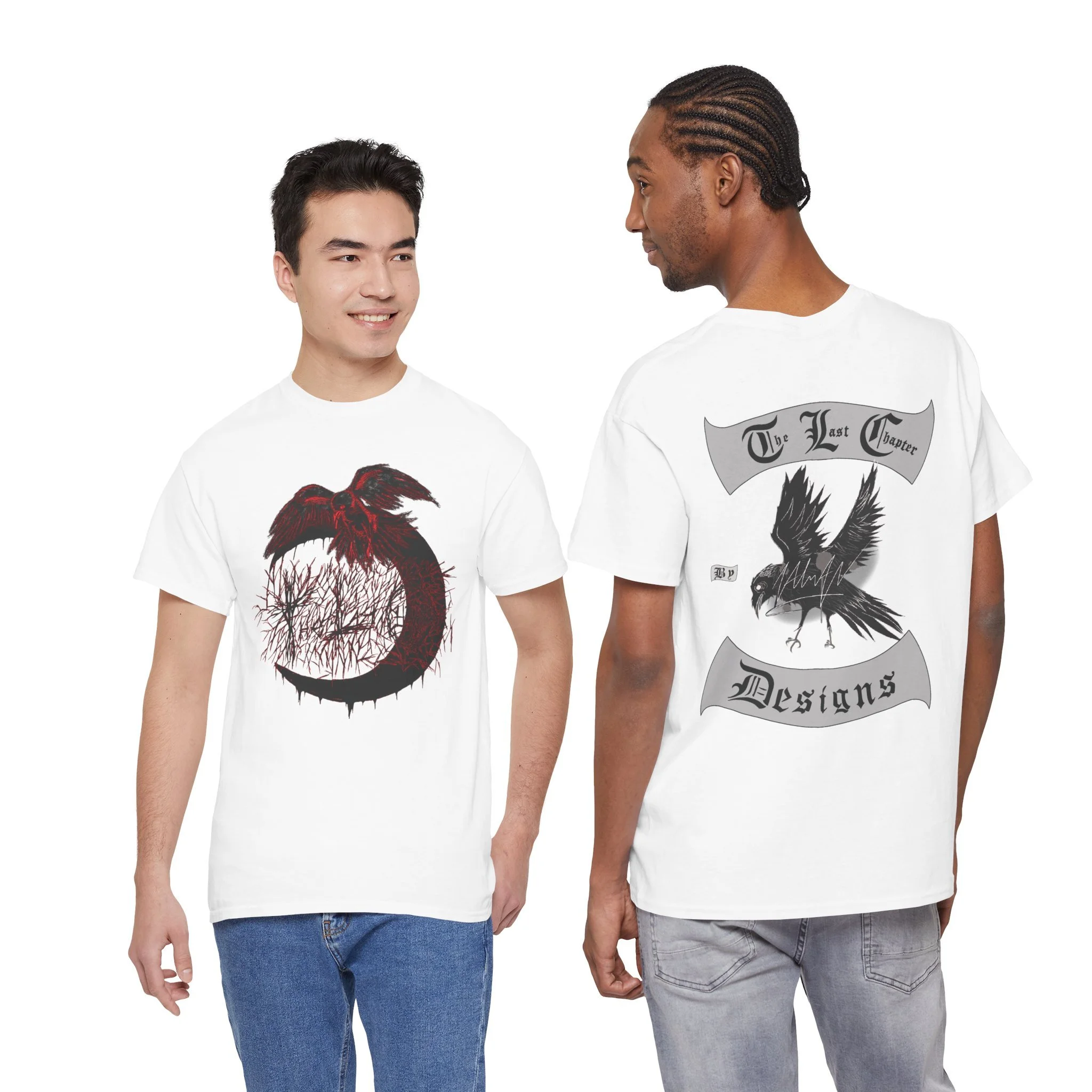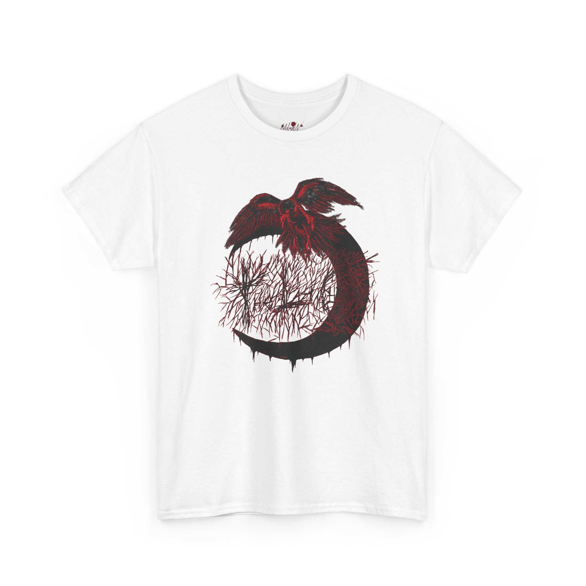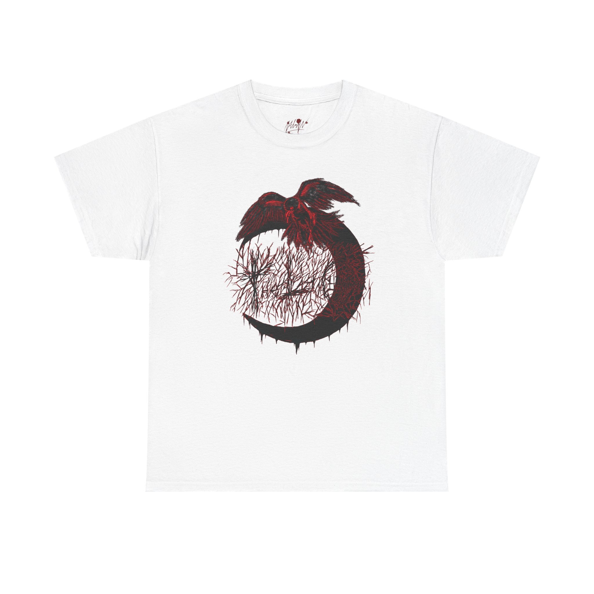 This cotton tee carries a raw, underground edge — a soft white canvas printed with bold grayscale art that leans punk and streetwear. The front shows a defiant, sketch-like figure seated low, while the back features a snarling raven framed by gothic banners reading a maker’s name. It feels lived-in and expressive: the kind of shirt you reach for when you want your outfit to speak without shouting. Lightweight but sturdy, it layers easily under a denim jacket or wears alone with ripped jeans. Wear it to shows, late-night hangs, or when you want to bring a bit of gritty attitude to a quiet day.