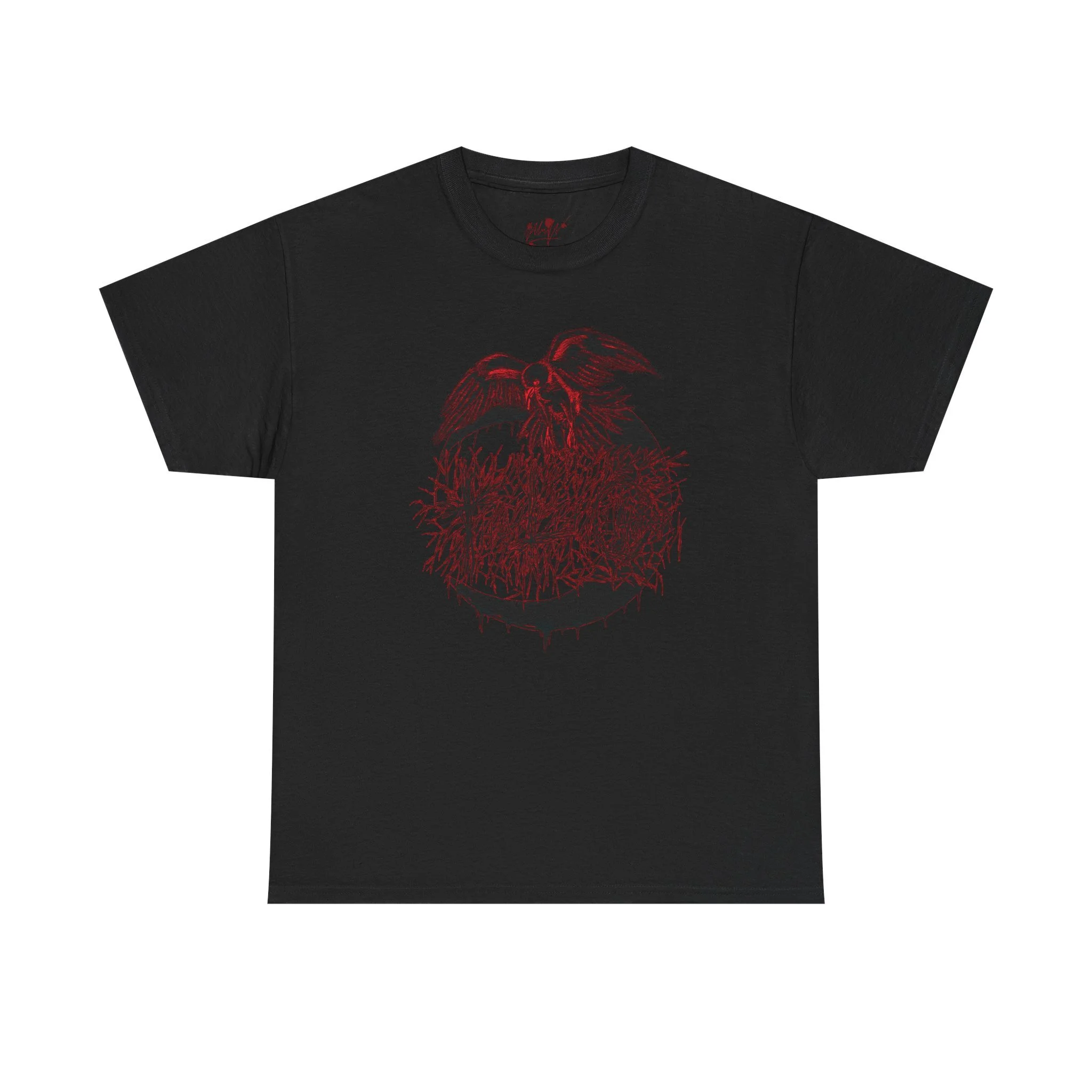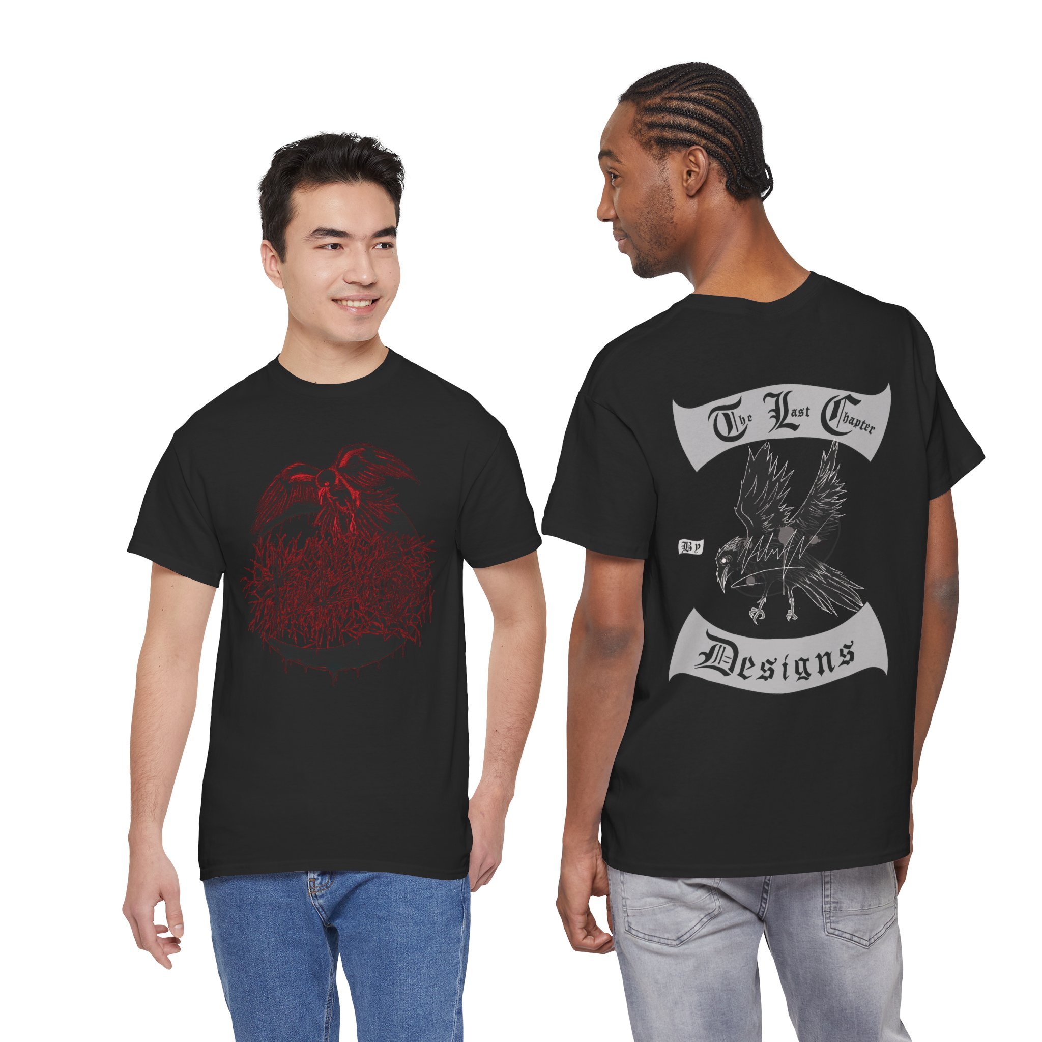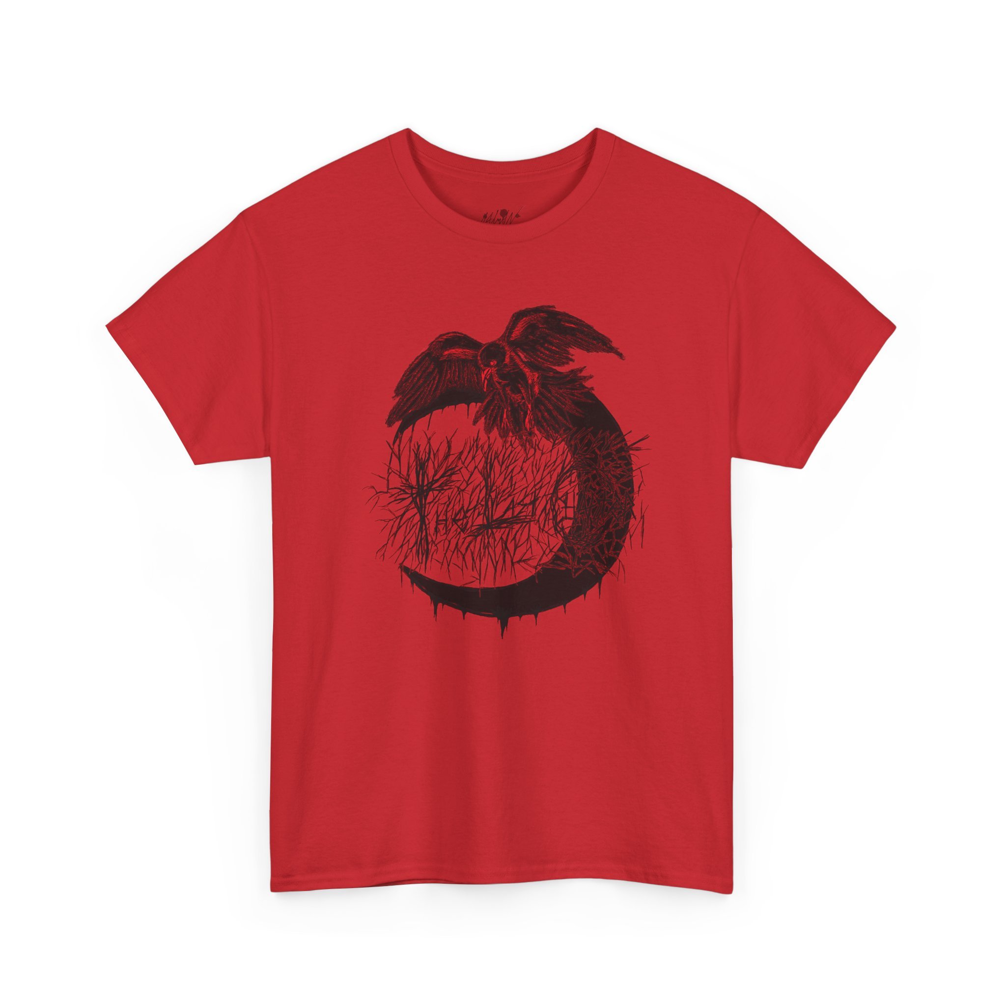 This cotton tee carries a raw, underground edge — a soft white canvas printed with bold grayscale art that leans punk and streetwear. The front shows a defiant, sketch-like figure seated low, while the back features a snarling raven framed by gothic banners reading a maker’s name. It feels lived-in and expressive: the kind of shirt you reach for when you want your outfit to speak without shouting. Lightweight but sturdy, it layers easily under a denim jacket or wears alone with ripped jeans. Wear it to shows, late-night hangs, or when you want to bring a bit of gritty attitude to a quiet day.