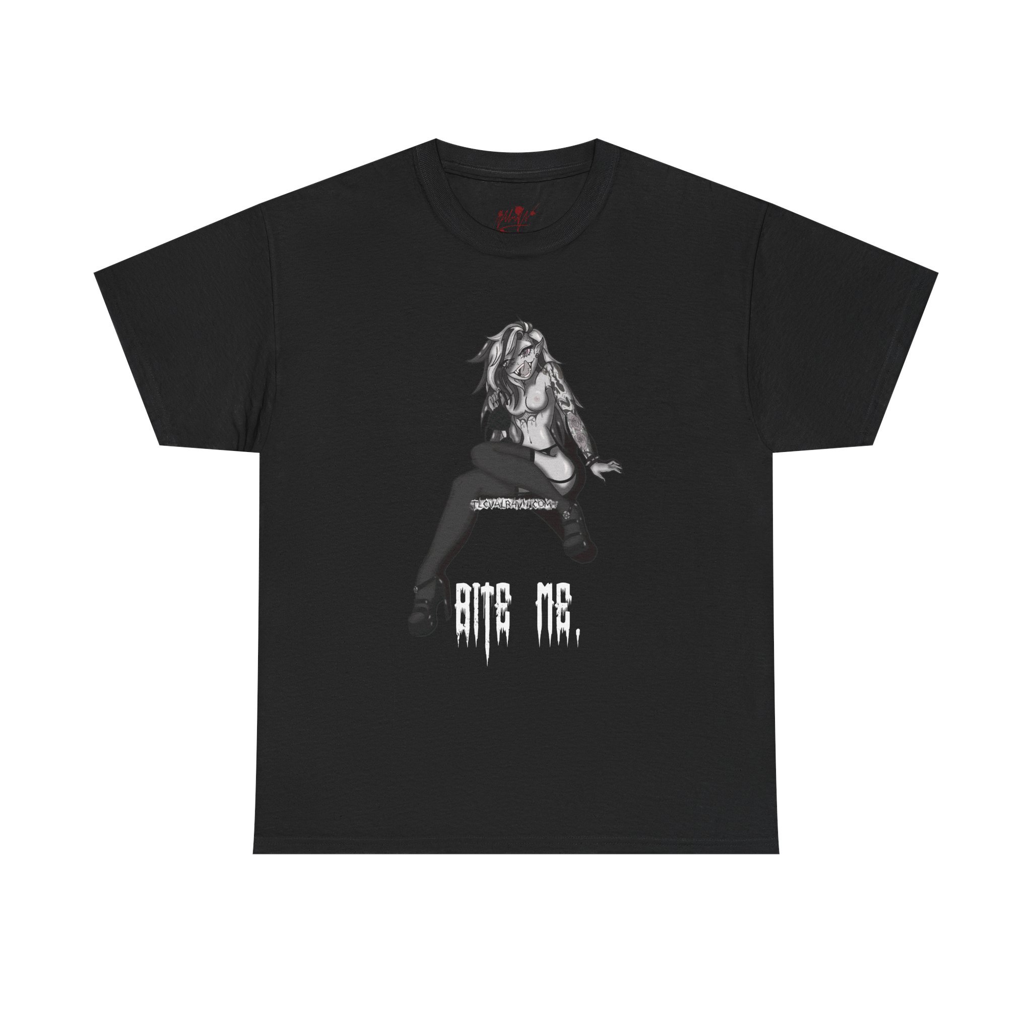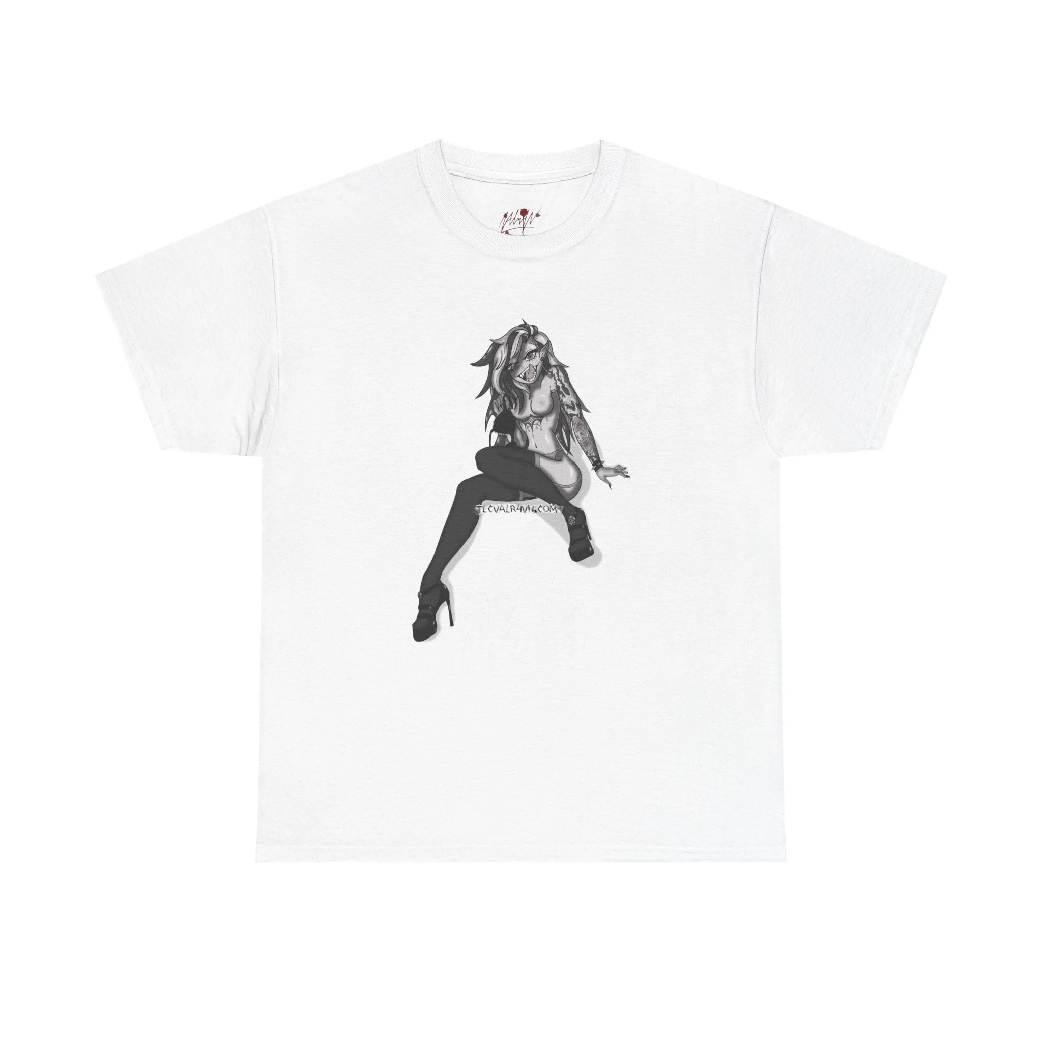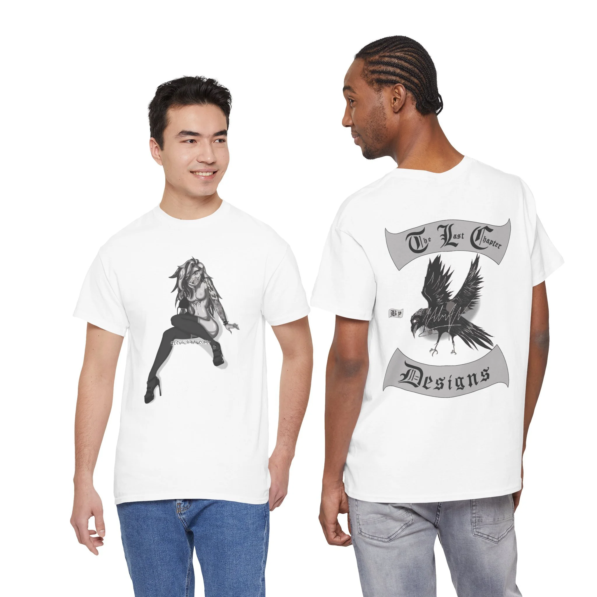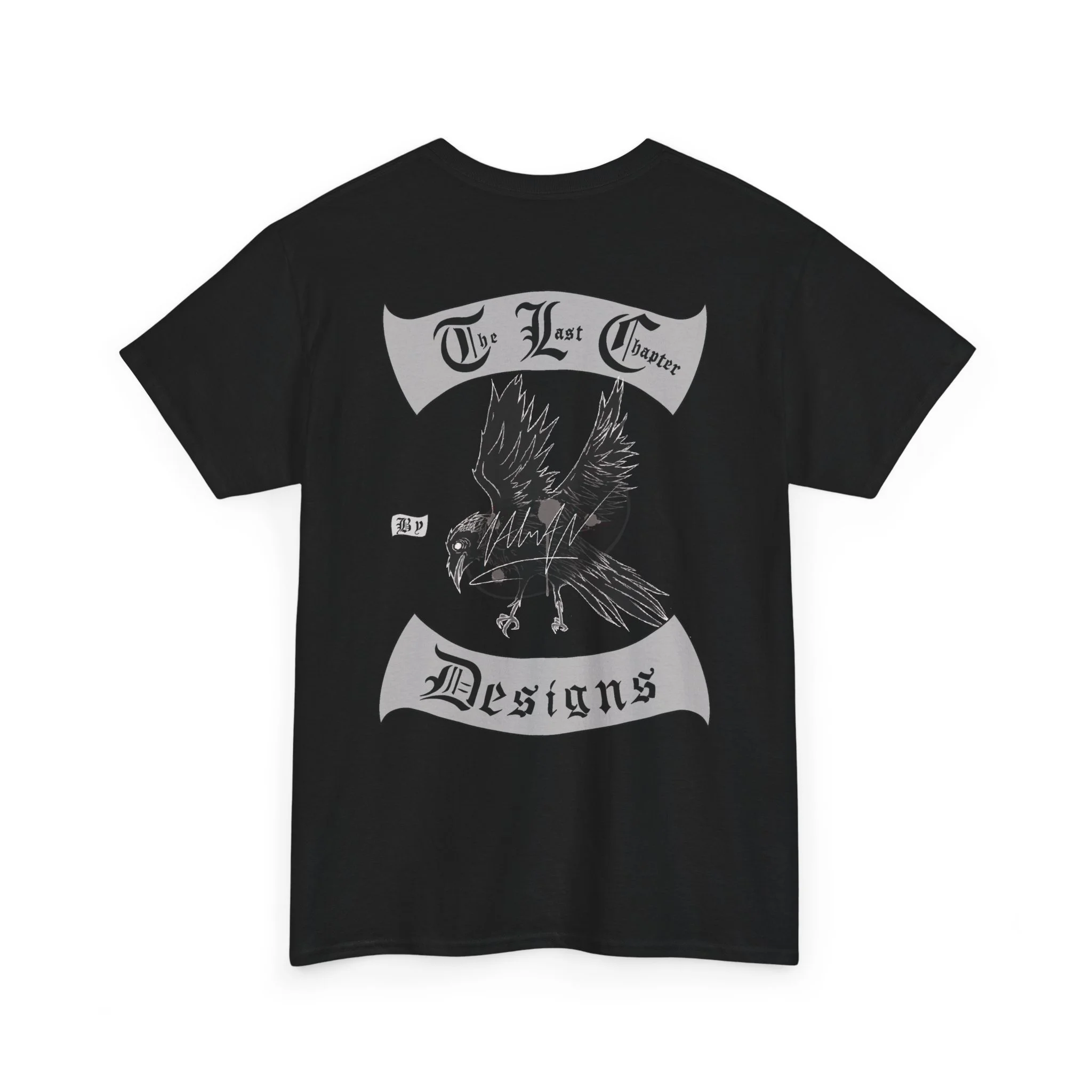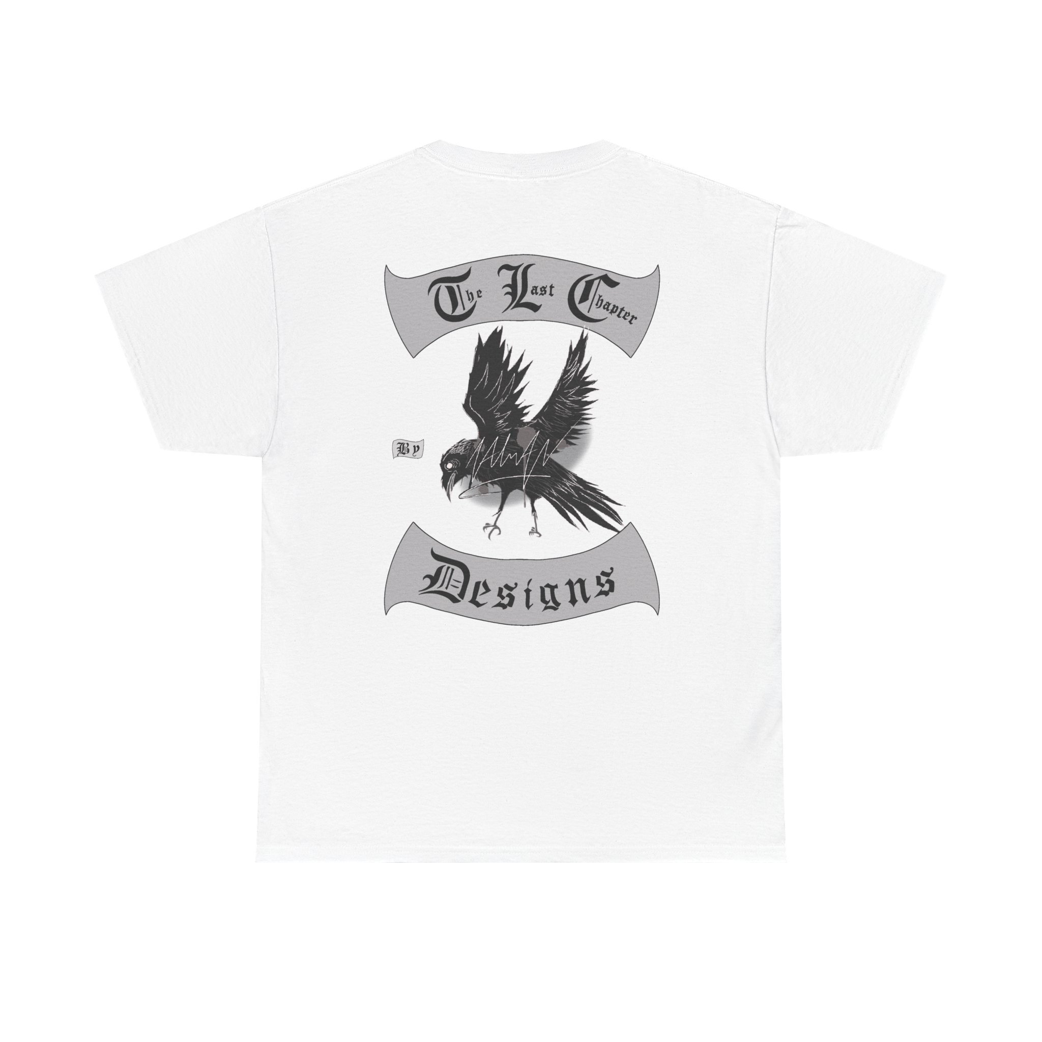 This cotton tee carries a raw, underground edge — a soft white canvas printed with bold grayscale art that leans punk and streetwear. The front shows a defiant, sketch-like figure seated low, while the back features a snarling raven framed by gothic banners reading a maker’s name. It feels lived-in and expressive: the kind of shirt you reach for when you want your outfit to speak without shouting. Lightweight but sturdy, it layers easily under a denim jacket or wears alone with ripped jeans. Wear it to shows, late-night hangs, or when you want to bring a bit of gritty attitude to a quiet day.