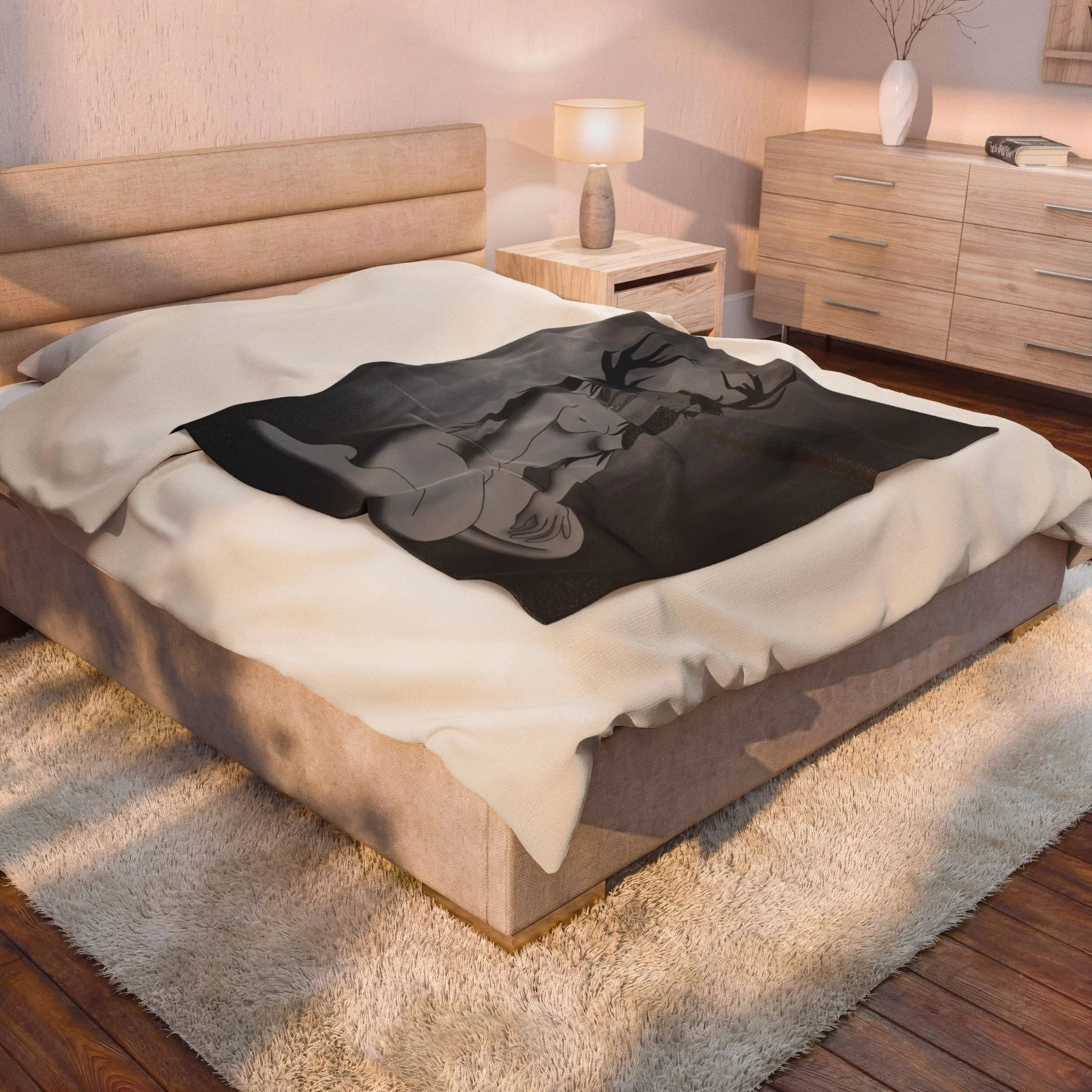 A velvety, art-forward blanket that feels like a hush of midnight on your skin. The medium-heavy polyester nap holds rich grayscale detail so the haunting illustration — a seated, nude figure wearing an antlered skull — reads with depth and texture. Draped over a couch, layered on a bed, or folded at the foot of a reading chair, it invites quiet moments: candle-lit sketching sessions, slow Sunday mornings, or late-night film watching with a moody playlist on. The fabric is plush and slightly weighty, so it warms without feeling bulky. The single-sided, high-detail print keeps the image sharp while the reverse stays soft and subtle. Durable double-needle topstitching means the blanket looks cared-for night after night, and the materials meet safety and compliance standards for peace of mind.